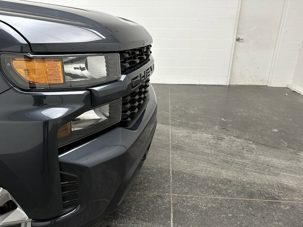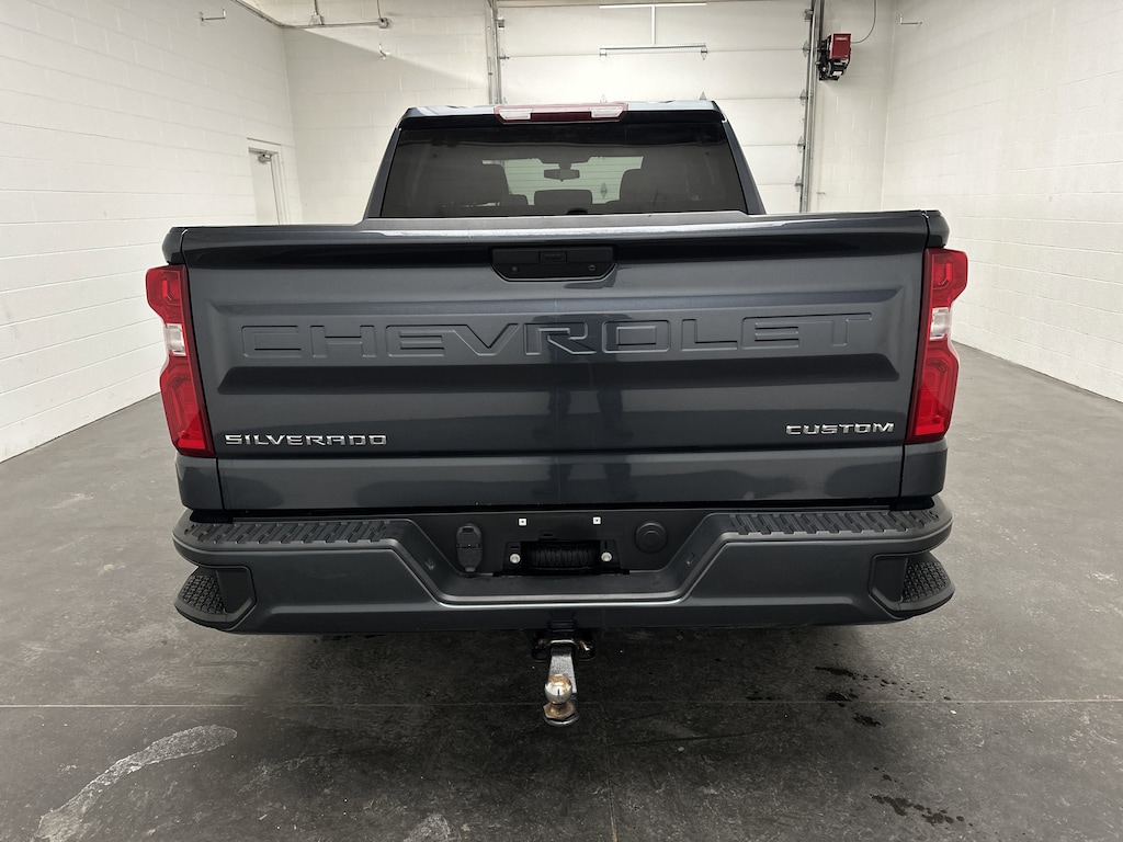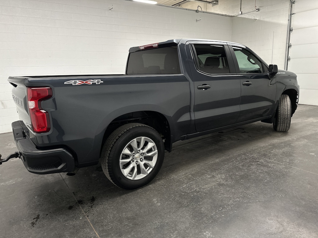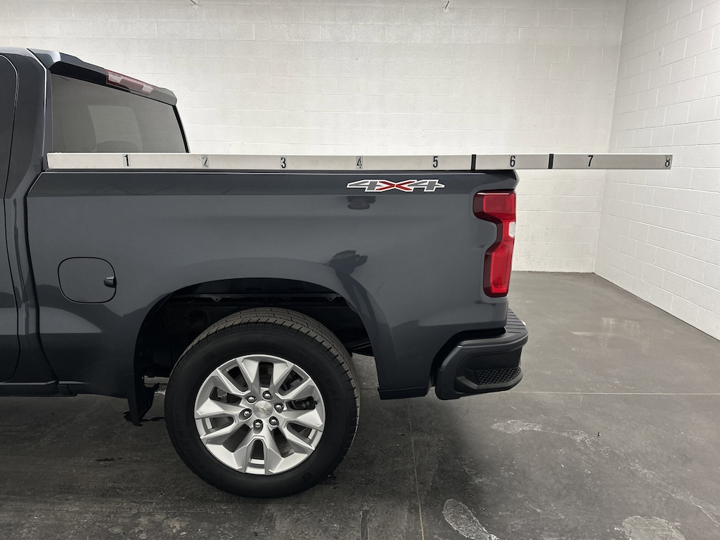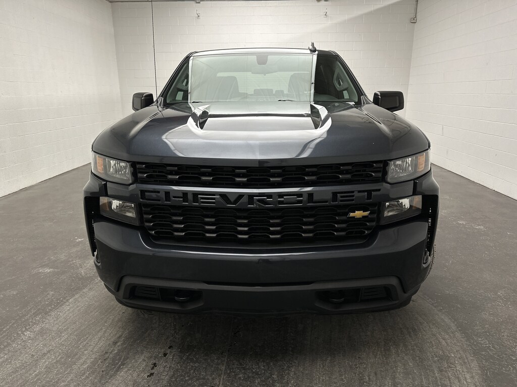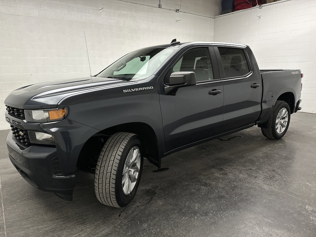 We have on the lot a 2021 Chevrolet Silverado 1500 Custom Crew Cab Pickup - it's finished in Shadow Gray Metallic, with a Jet Black Cloth interior. This Silverado currently has 60,783 miles and is powered by a turbocharged 2.7L gasoline engine paired with an 8-speed automatic transmission and confident 4WD capability, delivering an EPA-estimated 19 MPG city and 22 MPG highway.