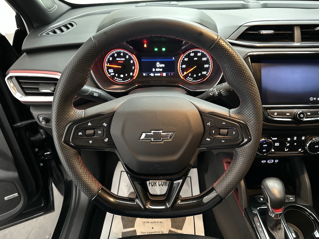 We've just taken in a 2023 Chevrolet Trailblazer RS SUV - it's finished in Mosaic Black Metallic, with a Jet Black with Red accents Cloth/Leatherette interior. This Trailblazer shows JUST 43,582 miles and is powered by a turbocharged 1.3L gasoline engine paired with a smooth 9-speed automatic transmission and confident all-wheel drive, delivering an efficient 26 MPG city and 30 MPG highway.