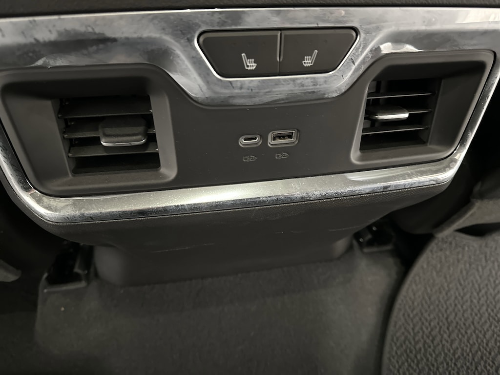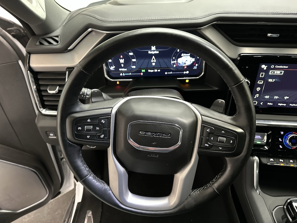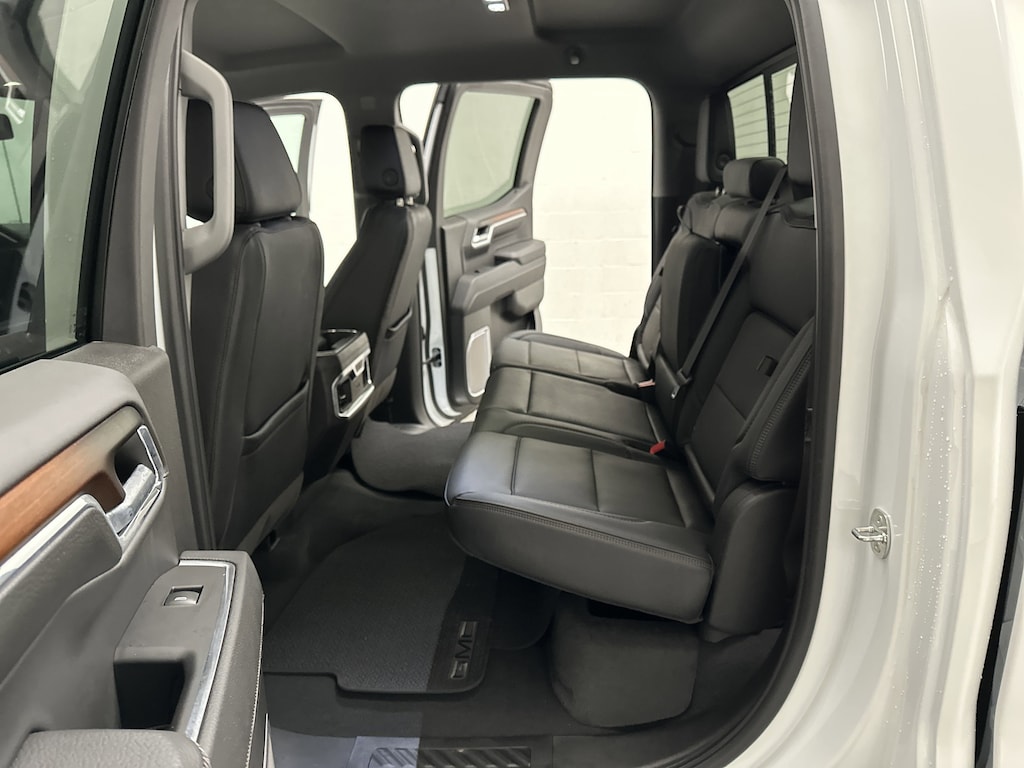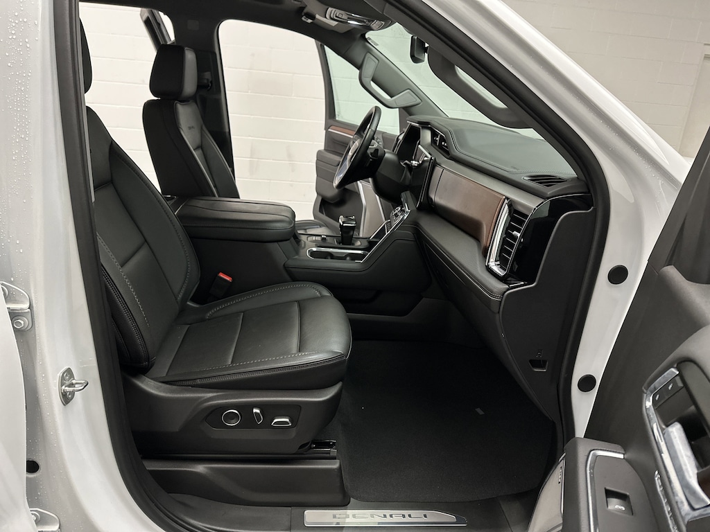 Inside, the Denali experience shines. Premium Jet Black perforated leather bucket seats provide both heating and ventilation up front, while rear seats are heated as well. The driver and passenger enjoy 12-way power adjustments with memory, while a heated steering wheel and dual-zone climate control keep everyone comfortable. Modern conveniences like remote start, keyless open, and a power sliding rear window enhance day-to-day ease.